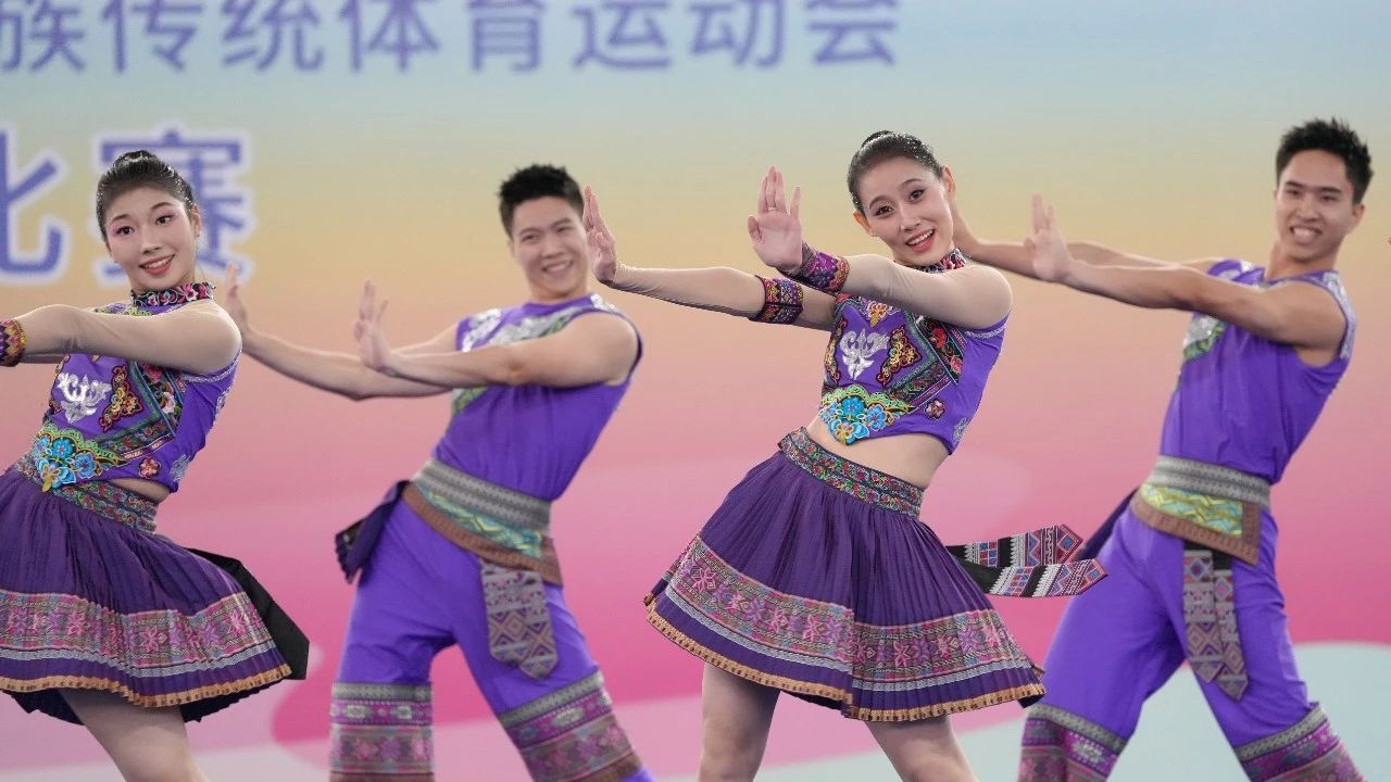 北京市代表团的姑娘和小伙子们身着盛装,在高亢嘹亮的苗族飞歌伴奏下,踏着铿锵有力的木鼓声,演绎了反排木鼓舞、芦笙舞、锦鸡舞等苗族舞蹈精粹,既保留了原生态文化特色,也展现了健身操的力度与美感。充满着坚韧与力量、团结与希望的表演令人久久沉醉其间。自选套路(徒手)第二轮比赛中得到的9.525分的全场最高分,在民族健身操比赛中实属罕见。